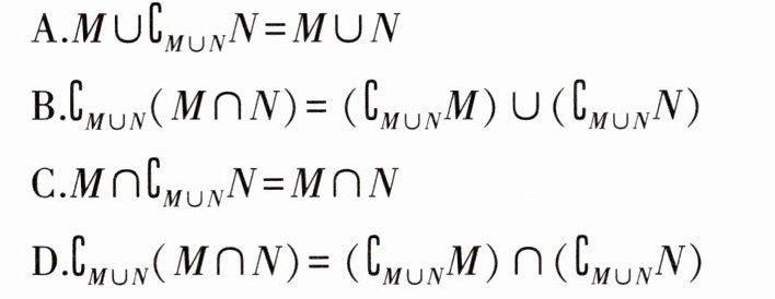 对于D,$\complement_{M\cup N}(M\cap N)$为区域①和③,而$\complement_{M\cup N}M$为区域③,$\complement_{M\cup N}N$为区域①,所以$(\complement_{M\cup N}M)\cap(\complement_{M\cup N}N)$为空集,所以D错误。排除A、C、D,故选B.