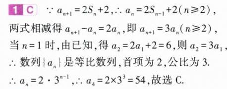 1.(2023天津,6,5分,易)已知数列$\{ a_{n}\}$的前$n$项和为$S_{n}$.若$a_{1}=2,a_{n + 1}=2S_{n}+2(n\in\mathbf{N}^{*})$,则$a_{4}=$ ( )