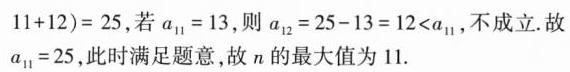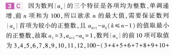 3.(2021北京,10,4分,中)已知$\{ a_{n}\}$是各项均为整数的递增数列,且$a_{1}\geqslant3$.若$a_{1}+a_{2}+\cdots +a_{n}=100$,则$n$的最大值为 ( )