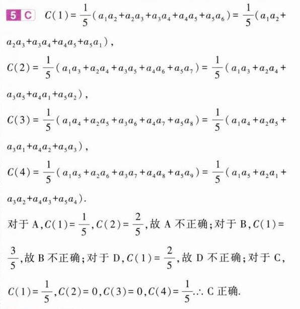 5.(2020课标Ⅱ理,12,5分,难)0 - 1周期序列在通信技术中有着重要应用.若序列$a_{1}a_{2}\cdots a_{n}\cdots$满足$a_{i}\in\{ 0,1\} (i = 1,2,\cdots)$,且存在正整数$m$,使得$a_{i + m}=a_{i}(i = 1,2,\cdots)$成立,则称其为0 - 1周期序列,并称满足$a_{i + m}=a_{i}(i = 1,2,\cdots)$的最小正整数$m$为这个序列的周期.对于周期为$m$的0 - 1序列$a_{1}a_{2}\cdots a_{n}\cdots$,$C(k)=\frac{1}{m}\sum_{i = 1}^{m}a_{i}a_{i + k}(k = 1,2,\cdots,m - 1)$是描述其性质的重要指标.下列周期为5的0 - 1序列中,满足$C(k)\leqslant\frac{1}{5}(k = 1,2,3,4)$的序列是 ( )