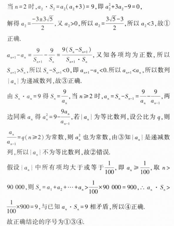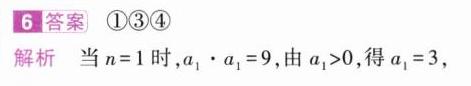 6.(2022北京,15,5分,难)已知数列$\{ a_{n}\}$的各项均为正数,其前$n$项和$S_{n}$满足$a_{n}\cdot S_{n}=9(n = 1,2,\cdots)$.给出下列四个结论: