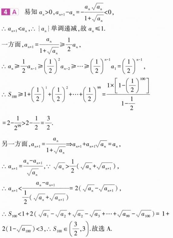 4.(2021浙江,10,4分,难)已知数列$\{ a_{n}\}$满足$a_{1}=1,a_{n + 1}=\frac{a_{n}}{1+\sqrt{a_{n}}}(n\in\mathbf{N}^{*})$.记数列$\{ a_{n}\}$的前$n$项和为$S_{n}$,则 ( )