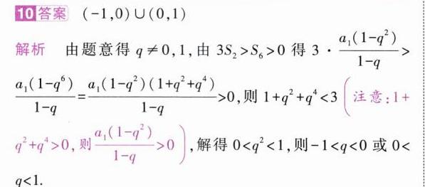 10.(2024湖北八市联考,13)设等比数列$\{ a_{n}\}$的前$n$项和为$S_{n}$,若$3S_{2}>S_{6}>0$,则公比$q$的取值范围为______________.