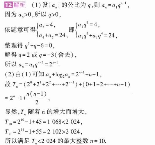 (2)记$\{ a_{n}+\log_{2}a_{n}\}$的前$n$项和为$T_{n}$,求满足$T_{n}<2024$的最大整数$n$.