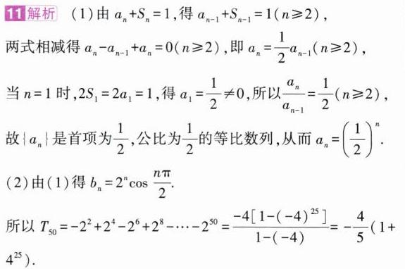 (2)数列$\{ b_{n}\}$满足$a_{n}b_{n}=\cos\frac{n\pi}{2}$,求$\{ b_{n}\}$的前50项和$T_{50}$.