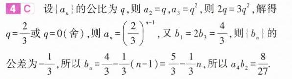 4.(2024山东新高考联合质量测评,3)已知数列$\{ a_{n}\}$是等比数列,$\{ b_{n}\}$是等差数列,$a_{1}=1$,若$b_{1},2a_{2},3a_{3},2b_{3}$为常数列,则$a_{4}b_{2}=$( )