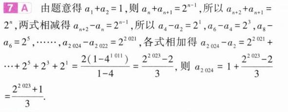 7.(2024山东潍坊一模,4)已知数列$\{ a_{n}\}$满足$a_{1}=0,a_{2}=1$.若数列$\{ a_{n}+a_{n + 1}\}$是公比为2的等比数列,则$a_{2024}=$( )