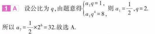 1.(2024山东青岛第一次适应性检测,1)等比数列$\{ a_{n}\}$中,$a_{2}=1,a_{5}=8$,则$a_{7}=$( )
