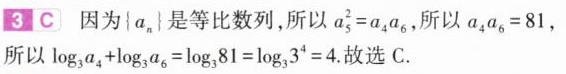 3.(2024安徽蚌埠教学质量检查,4)已知各项均为正数的等比数列$\{ a_{n}\}$中,若$a_{5}=9$,则$\log_{3}a_{4}+\log_{3}a_{6}=$( )