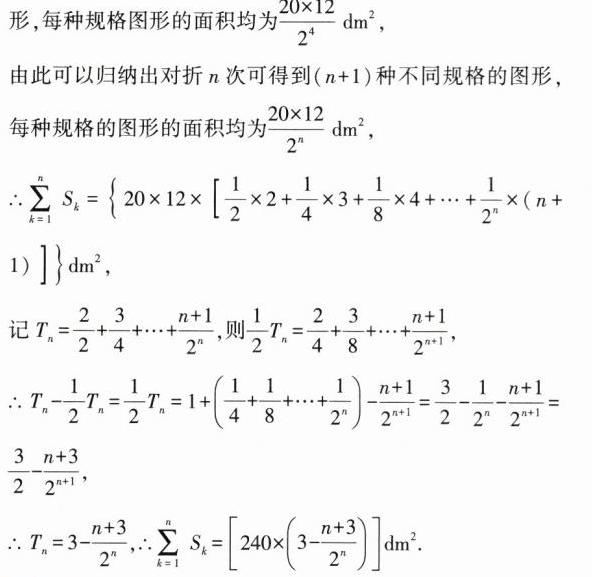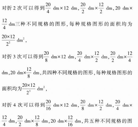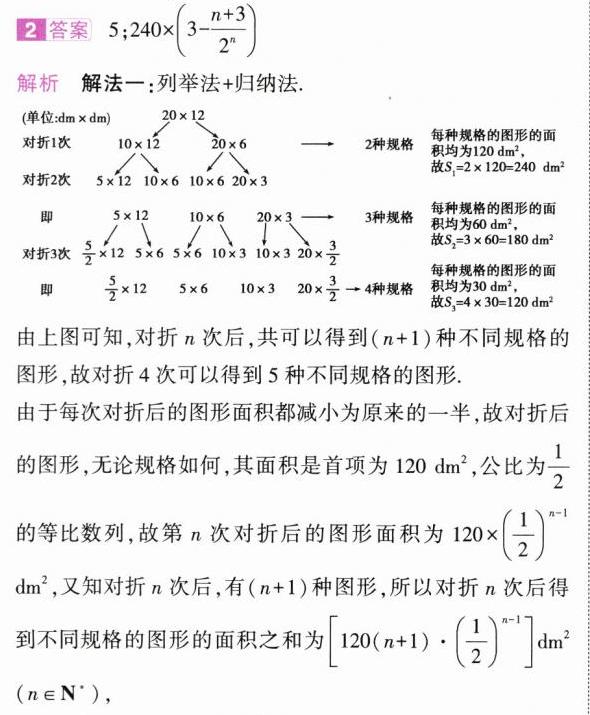 2.(2021新高考I,16,5分,难)某校学生在研究民间剪纸艺术时,发现剪纸时经常会沿纸的某条对称轴把纸对折.规格为$20\ \text{dm}\times12\ \text{dm}$的长方形纸,对折1次共可以得到$10\ \text{dm}\times12\ \text{dm},20\ \text{dm}\times6\ \text{dm}$两种规格的图形,它们的面积之和$S_{1}=240\ \text{dm}^{2}$,对折2次共可以得到$5\ \text{dm}\times12\ \text{dm},10\ \text{dm}\times6\ \text{dm},20\ \text{dm}\times3\ \text{dm}$三种规格的图形,它们的面积之和$S_{2}=180\ \text{dm}^{2}$,以此类推.则对折4次共可以得到不同规格图形的种数为______;如果对折$n$次,那么$\sum_{k = 1}^{n}S_{k}=$______$\text{dm}^{2}$.