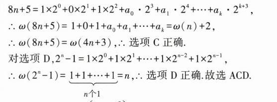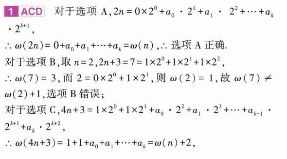 1.(多选)(2021新高考II,12,5分,难)设正整数$n=a_{0}\cdot 2^{0}+a_{1}\cdot 2^{1}+\cdots +a_{k - 1}\cdot 2^{k - 1}+a_{k}\cdot 2^{k}$,其中$a_{i}\in\{0,1\}$,记$\omega(n)=a_{0}+a_{1}+\cdots +a_{k}$,则 ( )