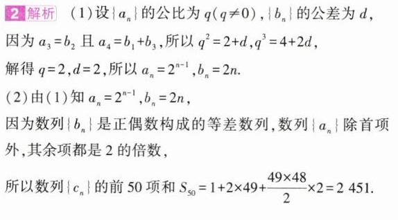 2. (2024江苏盐城六校联考,18)已知$\{ a_{n}\}$是首项为1的等比数列,$\{ b_{n}\}$是首项为2的等差数列,$a_{3}=b_{2}$且$a_{4}=b_{1}+b_{3}$.