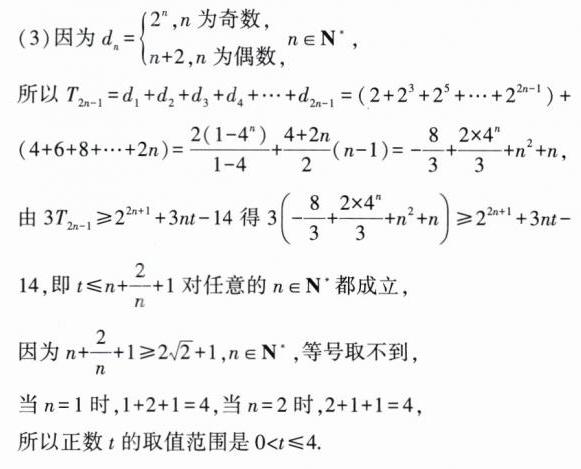 (3)设数列$\{ d_{n}\}$的通项公式为$d_{n}=\begin{cases}a_{n + 1},n为奇数\\\frac{b_{n}}{2}+2,n为偶数\end{cases},n\in N^{*}$,记$\{ d_{n}\}$的前$n$项和为$T_{n}$,若$3T_{2n - 1}\geqslant2^{n + 1}+3nt - 14$对任意的$n\in N^{*}$都成立,求正数$t$的取值范围.