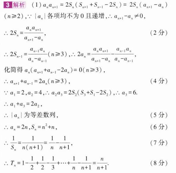 3. (新定义理解)(2024山东泰安一模,19)已知各项均不为0的递增数列$\{ a_{n}\}$的前$n$项和为$S_{n}$,且$a_{1}=2,a_{2}=4,a_{n}a_{n + 1}=2S_{n}(S_{n + 1}+S_{n - 1}-2S_{n})(n\in N^{*},且n\geqslant2)$.