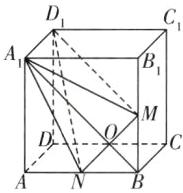 解析 解法一:如图,易知$MN=\sqrt{2}$,连接$A_{1}B$交$MN$于点$O$,则$A_{1}O=\frac{3\sqrt{2}}{2}$,$\therefore V_{A_{1}-DMN}=V_{D_{1}-A_{1}MN}=\frac{1}{3}\times\frac{1}{2}\times\sqrt{2}\times\frac{3\sqrt{2}}{2}\times2 = 1$.