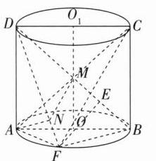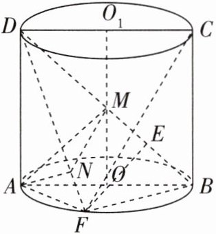 4.(多选)(2024河北石家庄一模,10)如图,在圆柱O₁O中,轴截面ABCD为正方形,点F是$\overset{\frown}{AB}$上一点,M为BD与轴O₁O的交点,E为MB的中点,N为A在DF上的射影,且EF//平面AMN,则下列选项正确的有 ( )