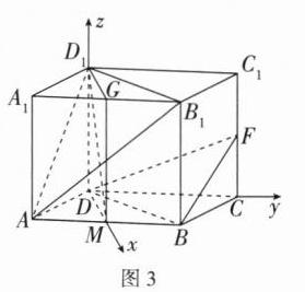 建立如图3所示的空间直角坐标系Dxyz。则D(0,0,0),不妨设AB = 2,AA₁ = 2a,则$A(\sqrt{3}, - 1,0)$,$B_{1}(\sqrt{3},1,2a)$,$D_{1}(0,0,2a)$,$B(\sqrt{3},1,0)$,$F(0,2,a)$,所以$\overrightarrow{AB_{1}}=(0,2,2a)$,$\overrightarrow{D_{1}B_{1}}=(\sqrt{3},1,0)$,$\overrightarrow{DB}=(\sqrt{3},1,0)$,$\overrightarrow{DF}=(0,2,a)$。设平面AB₁D₁的法向量为$\boldsymbol{n}=(x_{1},y_{1},z_{1})$,则$\begin{cases}\boldsymbol{n}\cdot\overrightarrow{AB_{1}}=0\\\boldsymbol{n}\cdot\overrightarrow{D_{1}B_{1}}=0\end{cases}$,即$\begin{cases}2y_{1}+2az_{1}=0\\\sqrt{3}x_{1}+y_{1}=0\end{cases}$,令$x_{1}=\sqrt{3}$,则$z_{1}=\frac{3}{a}$,$y_{1}=-3$,则$\boldsymbol{n}=(\sqrt{3},-3,\frac{3}{a})$,设平面BDF的法向量为$\boldsymbol{m}=(x_{2},y_{2},z_{2})$,则$\begin{cases}\boldsymbol{m}\cdot\overrightarrow{DB}=0\\\boldsymbol{m}\cdot\overrightarrow{DF}=0\end{cases}$,即$\begin{cases}\sqrt{3}x_{2}+y_{2}=0\\2y_{2}+az_{2}=0\end{cases}$,令$x_{2}=\sqrt{3}$,则$y_{2}=-3$,$z_{2}=\frac{6}{a}$,则$\boldsymbol{m}=(\sqrt{3},-3,\frac{6}{a})$,设平面AB₁D₁与平面BDF的夹角为θ,则$\cos\theta=\frac{\vert\boldsymbol{n}\cdot\boldsymbol{m}\vert}{\vert\boldsymbol{n}\vert\vert\boldsymbol{m}\vert}=\frac{\vert\sqrt{3}\times\sqrt{3}+(-3)\times(-3)+\frac{3}{a}\times\frac{6}{a}\vert}{\sqrt{12+\frac{9}{a^{2}}}\times\sqrt{12+\frac{36}{a^{2}}}}=\frac{12a^{2}+18}{\sqrt{12a^{2}+9}\times\sqrt{12a^{2}+36}}$,令$\frac{12a^{2}+18}{\sqrt{12a^{2}+9}\times\sqrt{12a^{2}+36}}=\frac{3\sqrt{10}}{10}$,解得$a^{2}=3$或$a^{2}=\frac{3}{4}$,所以$a=\sqrt{3}$或$a=\frac{\sqrt{3}}{2}$,所以$\frac{AA_{1}}{AB}=\frac{2\sqrt{3}}{2}=\sqrt{3}$或$\frac{AA_{1}}{AB}=\frac{\sqrt{3}}{2}$。