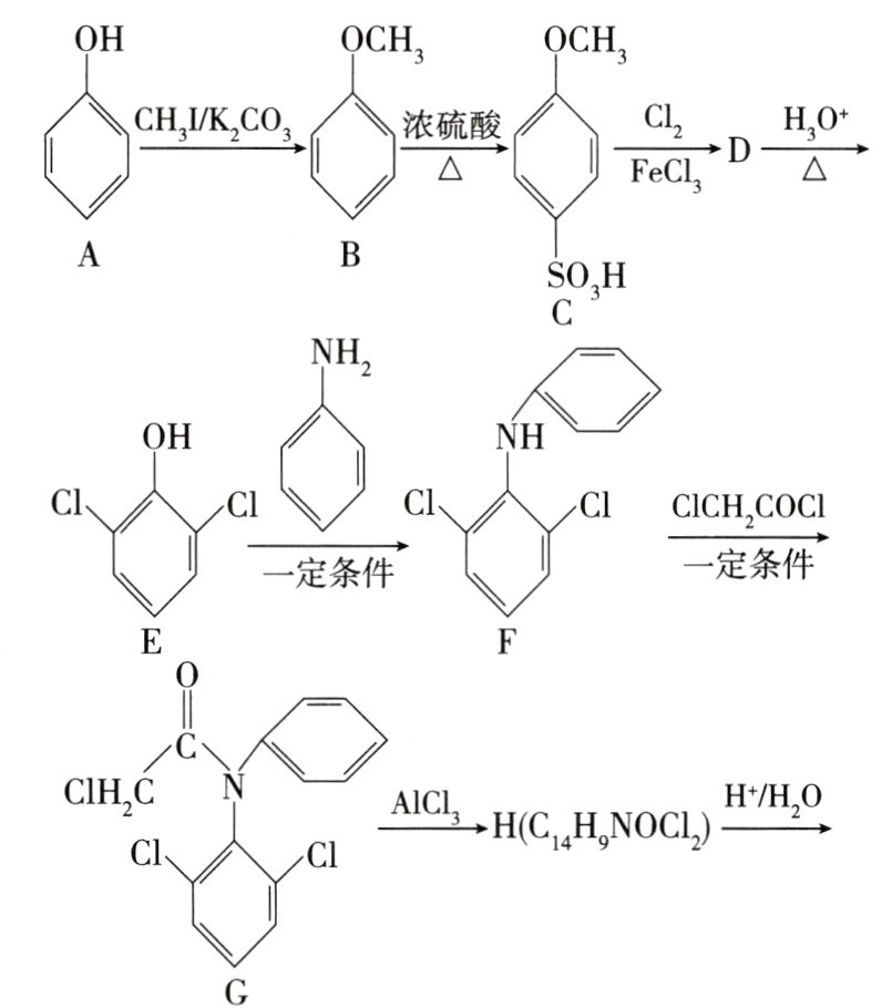 (2)根据已知Ⅱ中各取代基的定位效应,结合A、E的结构,可得A→B的目的是保护酚羟基;B→C引入—SO₃H(间位定位基)确保氯原子取代羟基的邻位。