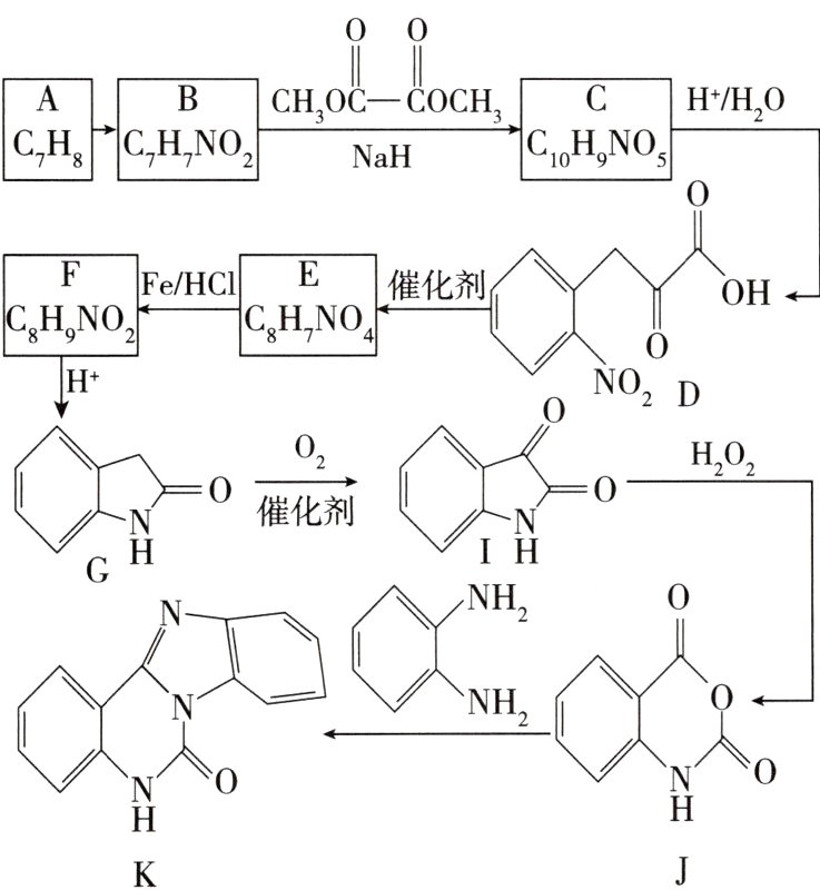 解析 A的分子式为C₇H₈,结合B、C的分子式及D的结构,可知A为甲苯,经硝化反应生成B,结合D的结构简式可知A→B过程中硝基取代甲基邻位的H原子,B是