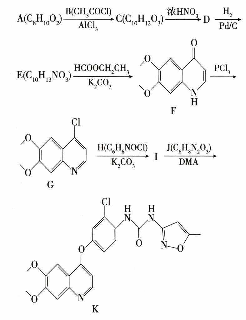$L\begin{array}{l}(C_{6}H_{5}OCl)\end{array}\xrightarrow[H^+]{CH_{3}I}M\begin{array}{l}(C_{7}H_{7}OCl)\end{array}\xrightarrow{浓 HNO_{3}}N\xrightarrow{HI}O\begin{array}{l}(C_{6}H_{4}NO_{3}Cl)\end{array}\xrightarrow[Pd/C]{H_{2}}H\xrightarrow{DMA}P\xrightarrow[K_{2}CO_{3}]{G}K$
