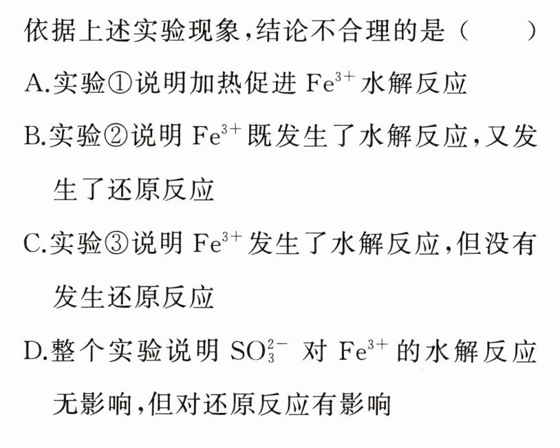 D A项,实验①中加热煮沸,体系颜色由棕黄色变为红褐色说明加热促进Fe³⁺水解生成Fe(OH)₃胶体,合理;B项,将实验②与实验①中现象相比较可知,SO₃²⁻促进了Fe³⁺水解生成Fe(OH)₃胶体,再滴加K₃[Fe(CN)₆]溶液,有蓝色沉淀生成,说明Fe³⁺与SO₃²⁻发生氧化还原反应生成Fe²⁺,合理;C项,实验③中Na₂SO₃过量,FeCl₃不足,滴加K₃[Fe(CN)₆]溶液,无蓝色沉淀生成,说明Fe³⁺与SO₃²⁻没有发生氧化还原反应生成Fe²⁺,溶液变红褐色,说明SO₃²⁻促进Fe³⁺水解生成Fe(OH)₃胶体,合理;D项,整个实验说明SO₃²⁻促进Fe³⁺水解,对比实验②和实验③可说明Fe³⁺与SO₃²⁻是否发生氧化还原反应受SO₃²⁻浓度的影响,不合理。