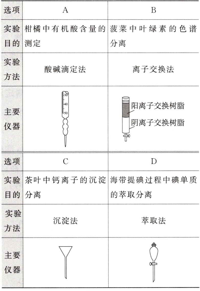 7B|柑橘中有机酸含量的测定,可采用酸碱滴定法,标准碱液盛放在碱式滴定管中,A项正确;色谱分离不使用离子交换树脂,B项错误;茶叶中钙离子的沉淀分离,可以将钙转化为沉淀后过滤,需使用漏斗,C项正确;海带提碘过程中碘单质可以使用有机溶剂萃取后分液分离,需使用分液漏斗,D项正确。