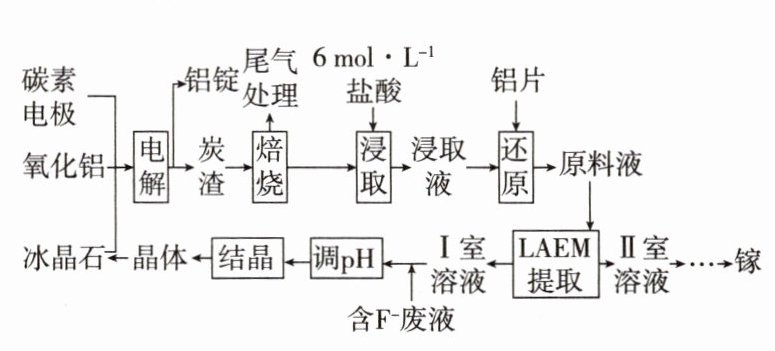 (5)“调pH”中,pH至少应大于________,使溶液中$c(F^{-})>c(HF)$,有利于$[AlF_{6}]^{3 - }$配离子及Na₃[AlF₆]晶体的生成。若“结晶”后溶液中$c(Na^{+}) = 0.10mol·L^{-1}$,则$[AlF_{6}]^{3 - }$的浓度为________mol·L⁻¹。