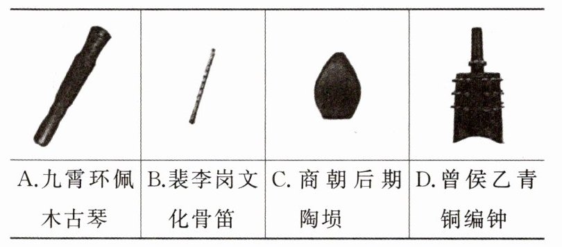 4 C 木古琴由木材制成,骨笛由动物骨骼制成,青铜编钟由合金制成。陶埙属于陶器,其主要成分是硅酸盐,故选C。