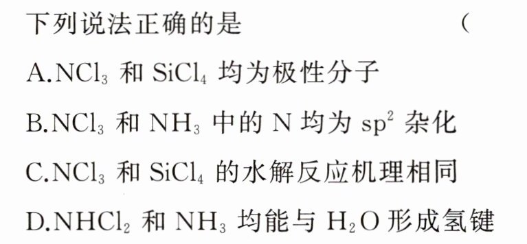 D A项,SiCl₄为非极性分子,错误。B项,NCl₃与NH₃中N原子的价层电子对数均为4,均采取sp³杂化,错误。C项,由NCl₃水解机理可知,NCl₃水解时H₂O中的H原子与NCl₃中N上的孤电子对结合,Cl原子与O—H中的O结合形成HClO,而SiCl₄中Si上无孤电子对,故SiCl₄的水解反应机理与之不相同,错误。D项,NHCl₂和NH₃分子中均存在N—H键,均能与H₂O形成氢键,正确。