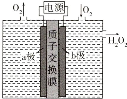 42D 由题图可知,电解池右侧O₂被还原为H₂O₂,故b极为阴极,a极为阳极。电解时,阳极的电极反应式为2H₂O-4e⁻ = 4H⁺+O₂↑,阴极的电极反应式为4H⁺+2O₂+4e⁻ = 2H₂O₂,A正确;根据电极反应式及溶液呈电中性原则可知,阳极生成的H⁺通过质子交换膜进入阴极区最终转化为H₂O₂,阳极区H⁺的物质的量浓度不发生变化,pH不变,B、C正确;设电解时转移电子4mol,则阳极生成1mol O₂,阴极消耗2mol O₂,D错误。