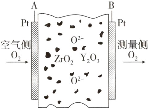 3 D 结合题图,$O_{2}$在测量侧生成,则在测量侧发生氧化反应,电极 B 为负极,电极 A 为正极,A 项正确。原电池中阴离子向负极迁移,则$O^{2 - }$由电极 A 向电极 B 迁移,B 项正确。电极 B 为负极,电极反应为$2O^{2 - } - 4e^{-}\xlongequal{\;\;}O_{2}\uparrow$,C 项正确。电池总反应为$O_{2}\xlongequal{\;\;}O_{2}$,则理论上电解质中的$O^{2 - }$的量不变,D 项不正确。