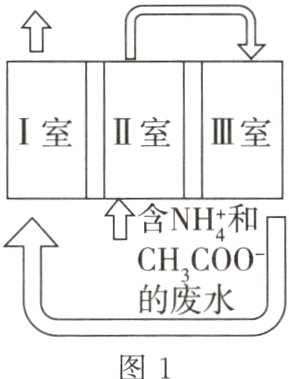 12 D 该装置为原电池,由图2知,Ⅰ室和Ⅲ室电极上$NO_{3}^{-}$、$O_{2}$分别被还原为$N_{2}$、$H_{2}O$,电极为正极,即阴极,则Ⅰ室和Ⅲ室为阴极室;Ⅱ室电极上$CH_{3}COO^{-}$被氧化为$CO_{2}$,电极为负极,Ⅱ室为阳极室[电化学中发生还原反应的一极为阴极,发生氧化反应的一极为阳极,即原电池中负极也称为阳极,正极也称为阴极],A项正确。Ⅱ室中电极反应式为$CH_{3}COO^{-}+2H_{2}O - 8e^{-}=2CO_{2}+7H^{+}$,Ⅲ室电极反应式为$O_{2}+4H^{+}+4e^{-}=2H_{2}O$,Ⅱ室产生$H^{+}$,Ⅲ室消耗$H^{+}$,故离子交换膜为阳离子交换膜,B项正确。由图1知,Ⅲ室中废液转移到Ⅰ室中,Ⅰ室中$NO_{3}^{-}$被还原为$N_{2}$,可知在Ⅲ室中$NH_{4}^{+}$转化为了$NO_{3}^{-}$,故Ⅲ室中还会发生反应$NH_{4}^{+}+2O_{2}=NO_{3}^{-}+2H^{+}+H_{2}O$,C项正确。Ⅰ室中电极反应式为$2NO_{3}^{-}+12H^{+}+10e^{-}=N_{2}\uparrow+6H_{2}O$,每生成3.5 g即0.125 mol $N_{2}$转移1.25 mol电子,消耗0.25 mol $NO_{3}^{-}$;根据电子转移守恒,可知Ⅲ室中阴极同样转移1.25 mol电子,Ⅲ室电极反应式为$O_{2}+4H^{+}+4e^{-}=2H_{2}O$,则消耗$O_{2}$的物质的量为0.312 5 mol,Ⅲ室中还发生反应$NH_{4}^{+}+2O_{2}=NO_{3}^{-}+2H^{+}+H_{2}O$,则每生成0.25 mol $NO_{3}^{-}$消耗0.5 mol $O_{2}$,理论上需要消耗$O_{2}$:0.312 5 mol + 0.5 mol = 0.812 5 mol,即26 g,D项错误。