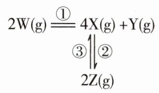 反应②和③的速率方程分别为v₂=k₂c²(X)和v₃=k₃c(Z),其中k₂、k₃分别为反应②和③的速率常数,反应③的活化能大于反应②。测得W(g)的浓度随时间的变化如下表。