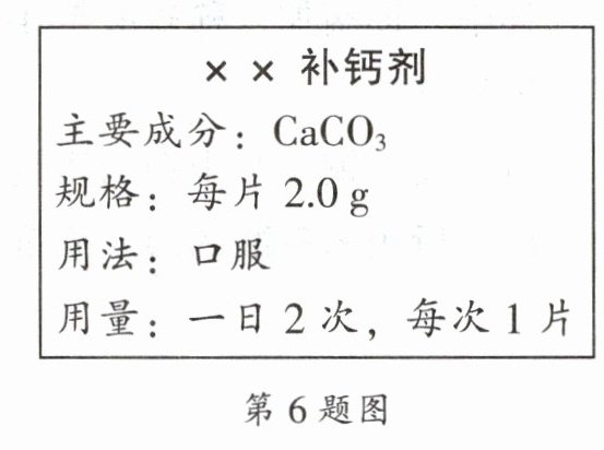 6. 钙是维持人体正常功能所必需的元素。下图所示为某种补钙剂说明书的一部分。取1片钙,放入盛有10 g稀盐酸的烧杯中,其中的碳酸钙跟盐酸恰好完全反应 (其他成分与盐酸不反应),烧杯内物质的质量变为11.34 g。请你计算: