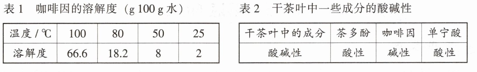 (2) 干茶叶中一些成分的酸碱性见表2。干茶叶粉碎加水,加CaO充分搅拌呈糊状,蒸干水分,干茶叶中参与反应的成分有______________________;再加热至120℃以上,可分离出表2中的成分是________。
