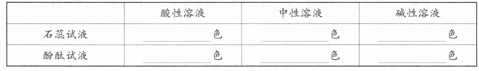 2. 在下列表格的空白处填上指示剂应显示的颜色。