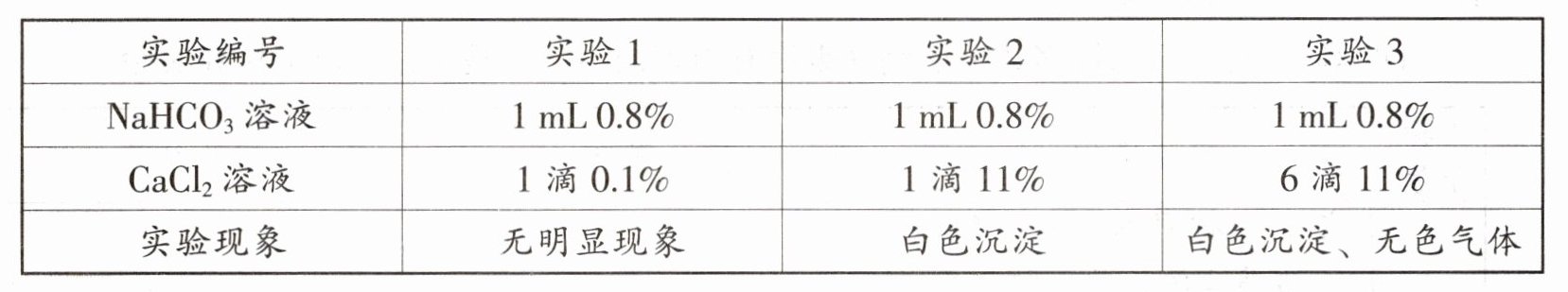 ③三组实验研究表明:1 mL 0.8%的NaHCO₃溶液与CaCl₂溶液混合后,能否观察到明显现象与______________________________相关。