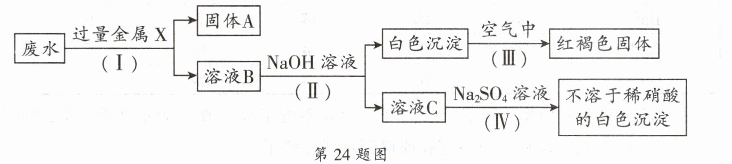 24. 某化工厂排出的废水透明、澄清、略显蓝色。一同学取少量废水,加入过量的盐酸,有不溶于稀硝酸的白色沉淀生成。过滤,所得的滤液分成两份,一份滤液中加入稀硫酸,也有不溶于稀硝酸的白色沉淀生成;另一份滤液中加入氢氧化钠溶液,产生蓝色溶液。