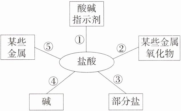 5. (2024山东滨州中考节选)小海用如图所示的思维导图总结了稀盐酸的五条化学性质。分析下图并回答问题: