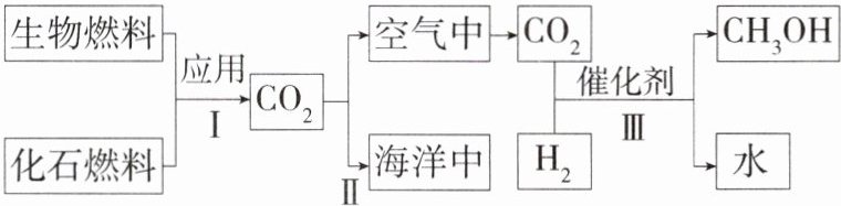 (2)过程Ⅱ利用海水进行碳储存,可以缓解空气中$CO_{2}$过多的问题。向海水中通入足量的$CO_{2}$,大约有1%的$CO_{2}$会和水反应,该反应的化学方程式为________________,反应的基本类型为________。过程Ⅲ中二氧化碳转化时发生反应的化学方程式为________________________。