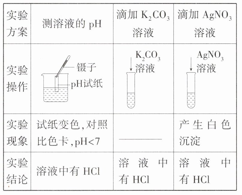 (2)为了验证其余猜想,各学习小组利用烧杯中的溶液,并选用了老师提供的pH试纸、$K_{2}CO_{3}$溶液、$AgNO_{3}$溶液,进行如下三个方案的探究。