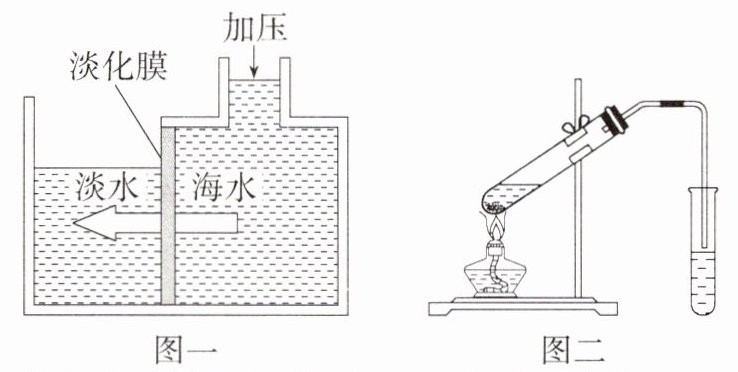 9.(2022山东济南济阳期末,10,★☆☆)海水淡化是解决淡水资源短缺的有效办法。如图是淡化海水的两种装置。图一所示为膜分离法淡化海水,水分子可以通过淡化膜(海水中体积较大的盐的离子和其他分子不能通过)进入左侧的淡水池,从而得到淡水;图二所示是蒸馏法淡化海水的简易装置。下列说法中,不正确的是 ( )