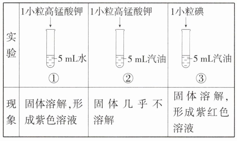 D 实验①②③共有高锰酸钾和碘两种溶质,不能说明水和汽油能溶解所有物质,故D错误。