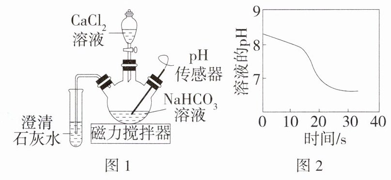 8. 数字化实验(2024江苏连云港中考,35,★★☆)利用如图1所示装置探究NaHCO₃溶液与CaCl₂溶液混合后发生的变化。常温下,向NaHCO₃溶液中匀速滴加CaCl₂溶液,pH传感器测得溶液的pH随时间变化如图2所示。一段时间后,三颈烧瓶和试管中均有白色沉淀生成。已知CaCl₂溶液呈中性。下列说法正确的是( )