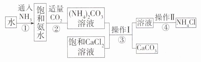 通入水NH₃ 饱和氨水 适量CO₂ (NH₄)₂CO₃溶液 饱和CaCl₂溶液 操作Ⅰ 溶液 操作Ⅱ NH₄Cl