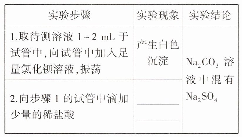 6. 课标新增·撰写实验报告 (2024 四川遂宁中考,12,★★☆)同学们学习了盐的相关知识后,知道 BaCO₃为白色固体,难溶于水;BaSO₄为白色固体,难溶于水和盐酸。他们运用所学知识分组设计并完成了“检验碳酸钠溶液中是否混有硫酸钠”的实验,请你帮助他们完成以下实验报告单并进行交流评价。