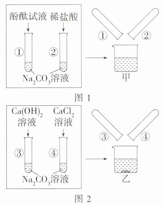 7. 学科素养·科学探究与实践 碳酸钠在生产和生活中都有重要的用途。图 1、图 2 是某兴趣小组探究碳酸钠化学性质时所做的两组实验。实验结束后,将两组实验试管中的物质分别全部倒入甲、乙两个洁净的烧杯中,据图回答下列问题。 (C9208004)