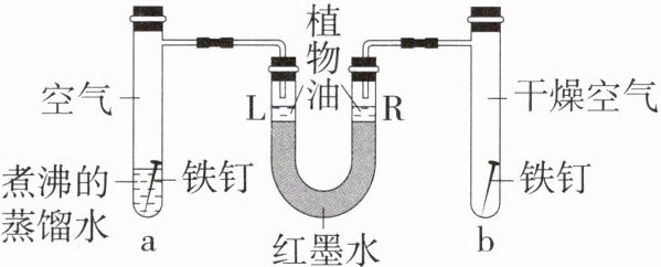 2. (2024山东德州夏津二模) 某同学设计了如图所示的装置探究铁锈蚀的条件。a管中装入少量煮沸的蒸馏水,b管中是干燥的空气。调节L端与R端的液面高度一致,塞紧橡胶塞。一周后观察。下列推断错误的是(C9209005) ( )