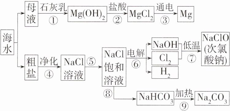(5)步骤⑦用烧碱低温制取次氯酸钠的反应原理为 Cl₂ + 2NaOH 低温 X + NaClO + H₂O,则 X 的化学式是______。