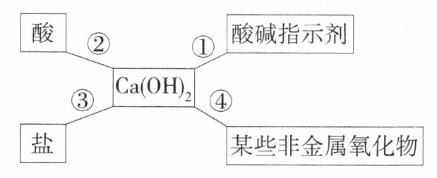 7. 对知识的归纳和总结是学好化学的重要方法。在学习了碱的性质后,小红同学总结了氢氧化钙的四条化学性质(如图,②将在第四节中学习),即氢氧化钙与图中四类物质能够发生化学反应。